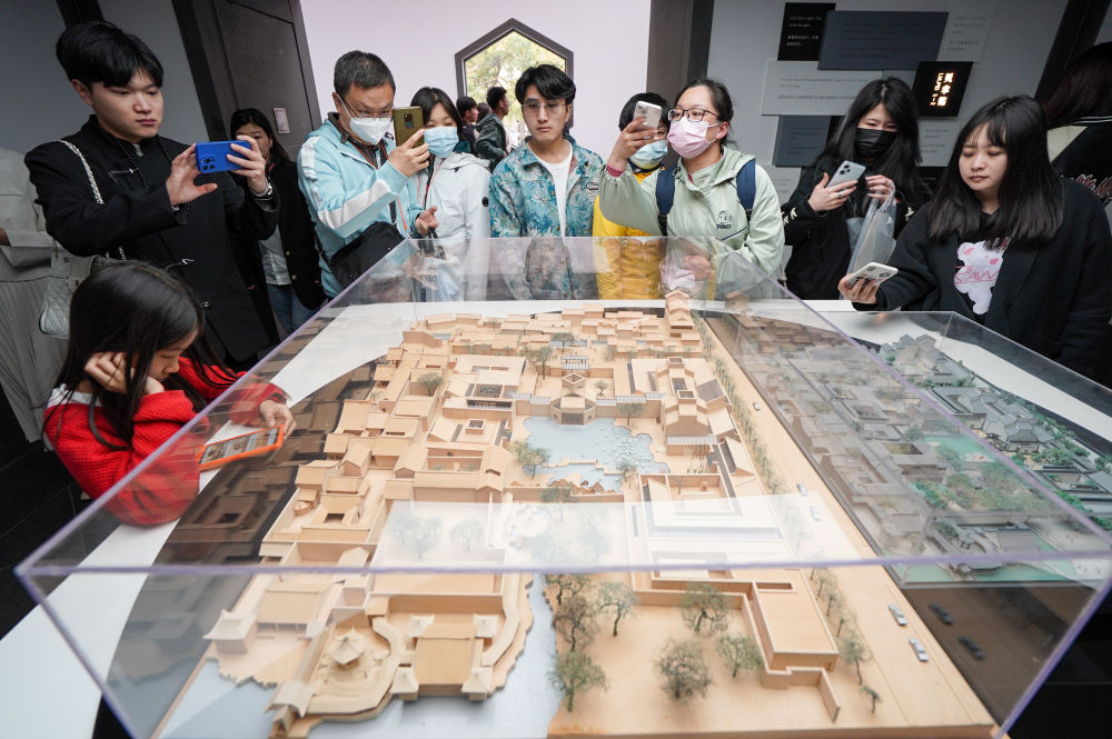 參觀者在蘇州博物館觀看蘇州博物館設計模型(2023年4月5日攝)。新華社記者 李博 攝