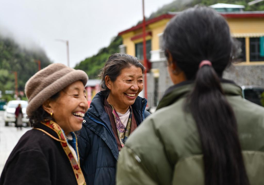 卓嘎(左一)、央宗(左二)在玉麥鄉街頭和街坊聊天(6月10日攝)。新華社記者 晉美多吉 攝