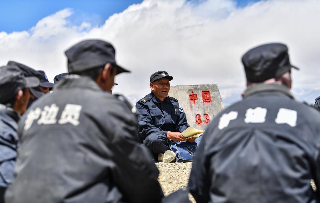 在33號界碑處,護邊隊在隊長的帶領下開展學習(6月2日攝)。新華社記者 晉美多吉 攝