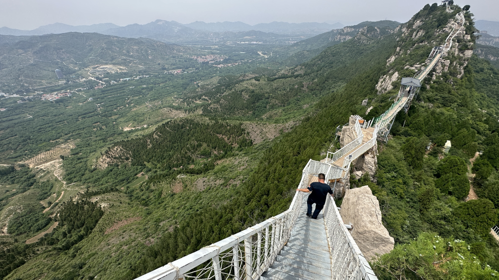 沿架設(shè)在山脊的棧道拾級而上,來到山東省濟南市長清區(qū)萬德街道靈巖村景區(qū)的制高點,陣陣松濤洗盡夏日的燥熱。放眼遠眺,藍天白云和郁郁蔥蔥的群山在視野盡頭相融,靈巖寺景區(qū)和村里的一眾游樂設(shè)施盡收眼底。