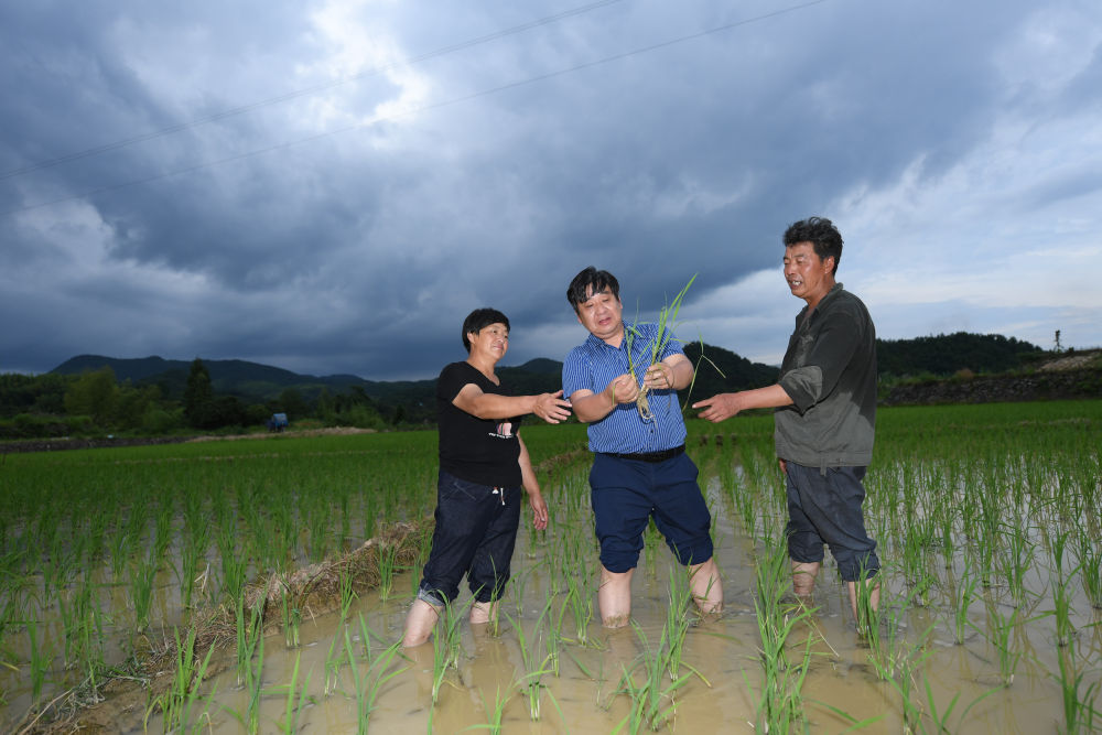 在浙江省仙居縣廣度鄉西角村,浙江大學環境與資源學院教授吳良歡(中)在省級科研試驗田里指導農戶進行水稻種植(7月4日攝)。新華社記者 翁忻旸 攝