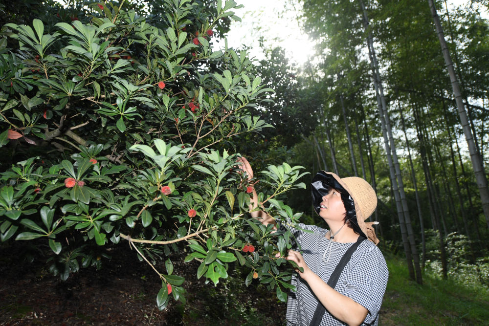 在浙江省仙居縣廣度鄉瓦垚頭村,浙江大學環境與資源學院教授吳良歡結對指導的村民鄭文娟在查看楊梅長勢(7月4日攝)。新華社記者 翁忻旸 攝