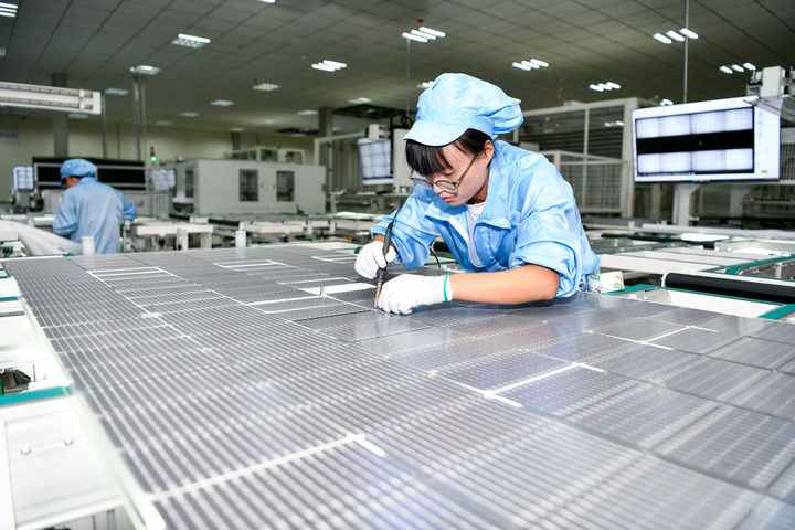 工人在位于貴州威寧經(jīng)濟(jì)開發(fā)區(qū)的貴州一道長通新能源有限公司生產(chǎn)太陽能光伏組件(7月19日攝)。新華社記者 楊文斌 攝