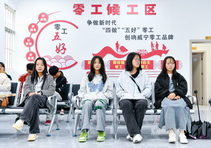 職業(yè)學(xué)校的學(xué)生在貴州省威寧縣人力資源服務(wù)產(chǎn)業(yè)園等待招聘會開始(7月19日攝)。新華社記者 楊文斌 攝