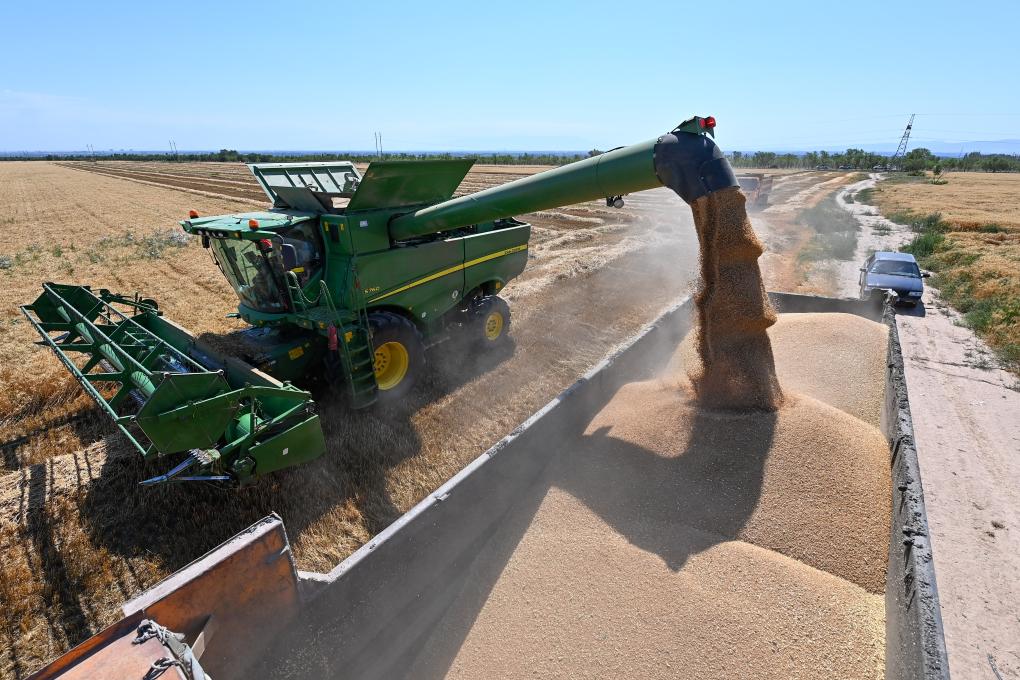 司張輝操作聯合收割機在新疆呼圖壁縣二十里店鎮寧州戶村將小麥裝車(7月15日攝)。新華社記者 丁磊 攝