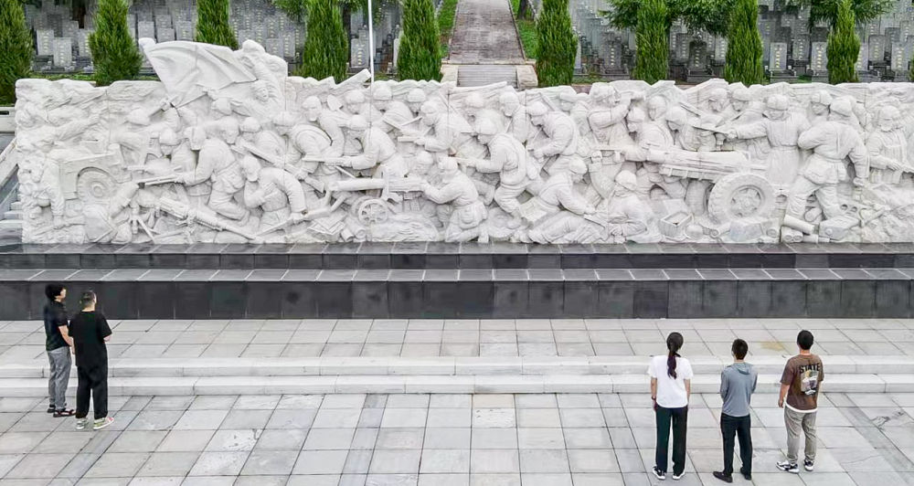 2023年7月13日,游客在吉林省集安市革命烈士陵園內觀看抗美援朝烈士浮雕紀念墻(無人機照片) 。新華社記者 周萬鵬 攝