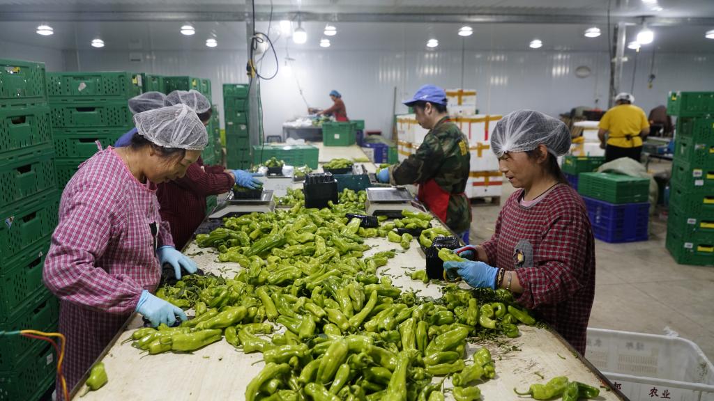 時值正午,屋外烈日當空,屋內一片涼爽。在恒溫26攝氏度的分揀廠房中,工人們正修剪、挑選、打包,一盒盒包裝精致的青椒、土豆等被送進物流箱,等待發貨。