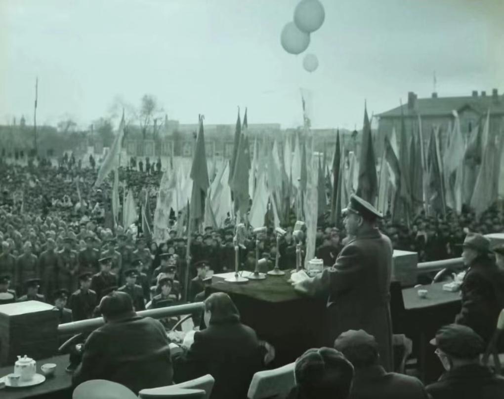 10月27日一早,舉行了盛大的歡迎大會。“歡迎志愿軍凱旋,怎么能沒有志愿軍的照片呢?”肖野回憶說,他特意繞到主席臺后側,爬上一張空桌子,從后往前拍下一張珍貴照片:主席臺前,一排排參會嘉賓正襟危坐。現場旌旗招展,威武的中國人民志愿軍整齊列隊,一個個昂首挺胸。