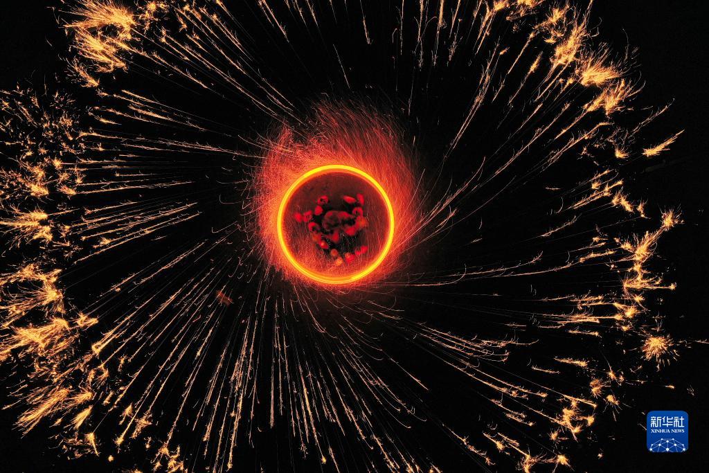 河北省灤平縣火斗山鎮(zhèn)大店子村的民間藝人在表演“掄花”(7月5日攝,無人機照片)。新華社記者 牟宇 攝
