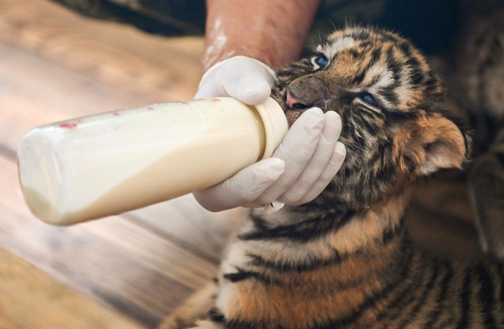 飼養員李鑫一會兒測量小老虎的體溫,一會兒給它們喂奶,密切觀測著“虎娃”們的動態,“為了保證小虎健康成長,我們每天都要嚴格消毒。如果有‘虎媽’奶水不足,會及時對小虎進行人工飼喂。”