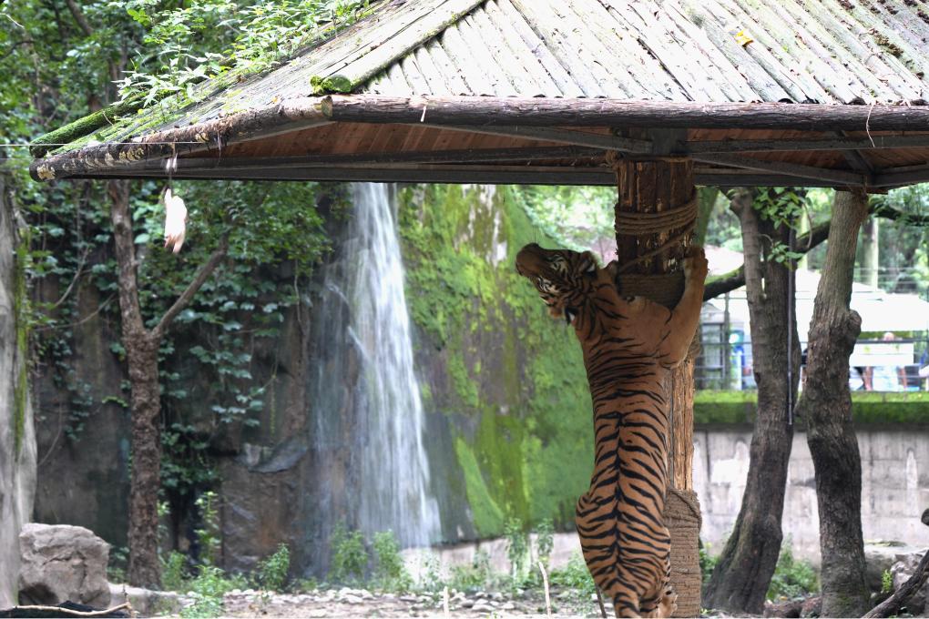工作人員介紹,目前上海動物園獅虎山生活著三種老虎:東北虎、華南虎、孟加拉虎。作為華南虎的重要繁育基地之一,動物園對這里的20余頭華南虎“建檔立卡”、報“戶口”、上“家譜”,科學施策、精心飼喂,同時建立華南虎基因庫,開展基因保護研究。