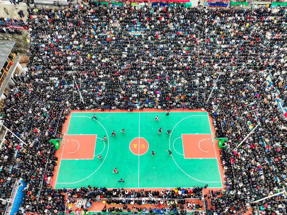 這是2023年3月27日在黔東南州臺江縣臺盤村拍攝的貴州省首屆“美麗鄉(xiāng)村”籃球聯(lián)賽總決賽比賽現(xiàn)場(無人機照片)。新華社記者 歐東衢 攝