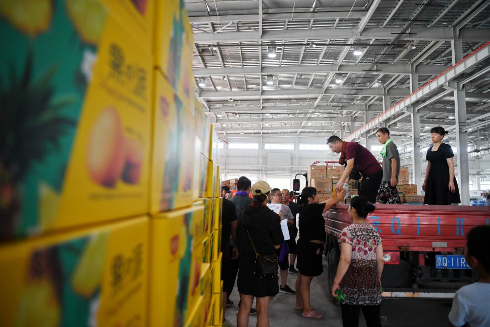 工作人員和志愿者在河北省涿州市鋼研物資儲備點內將捐贈物資裝車外運(8月5日攝)。新華社記者 牟宇 攝