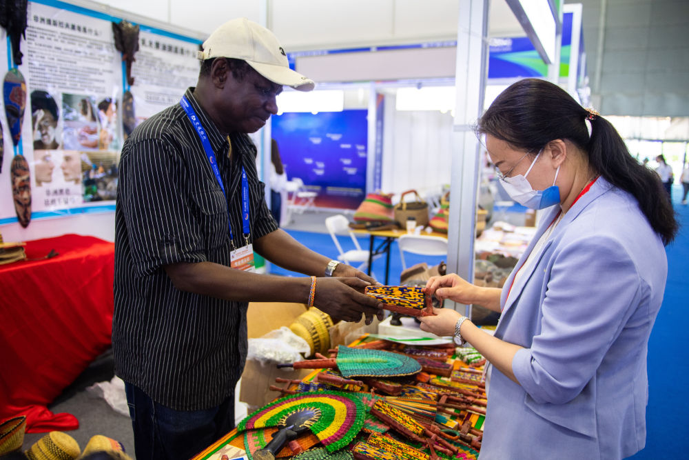 參展商(左)在第三屆中國-非洲經貿博覽會展會上向觀眾介紹產品(6月29日攝)。新華社記者 陳思汗 攝