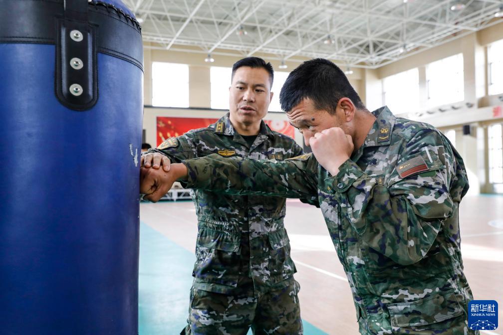 武警新疆總隊某支隊副參謀長成林(左)在搏擊館內為特戰隊員糾正動作(6月7日攝)。新華社發(馬士寶 攝)