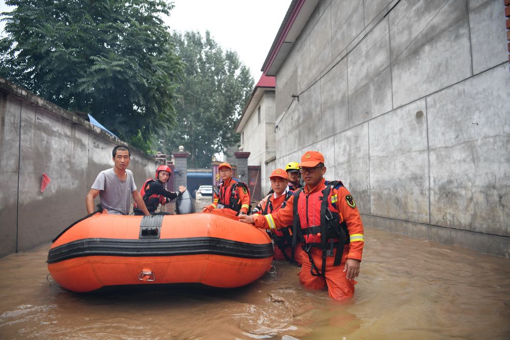 8月3日,衡水市消防救援支隊救援人員在涿州市碼頭鎮沙窩村內開展救援工作。新華社記者 牟宇 攝