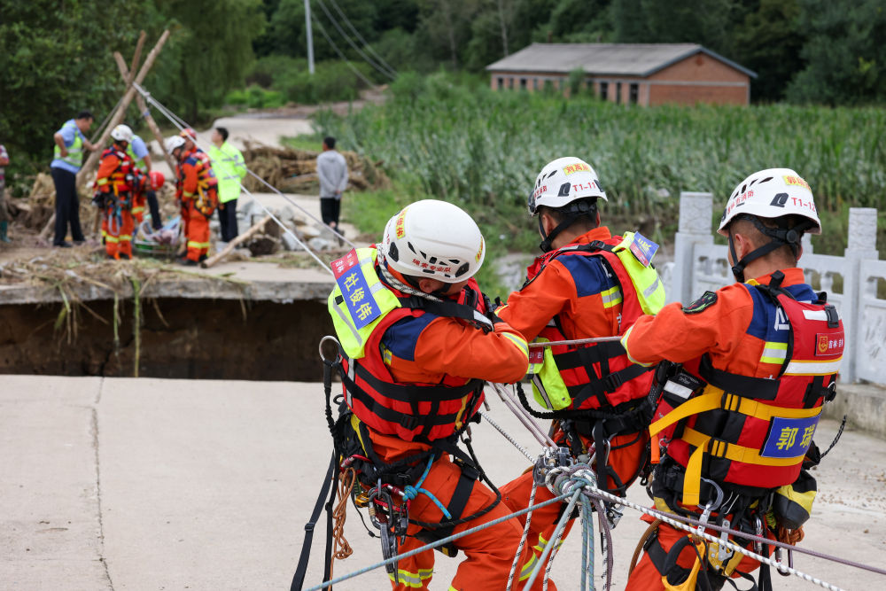 8月6日,吉林市消防救援支隊隊員利用繩橋解救受困村民。新華社記者 顏麟蘊 攝