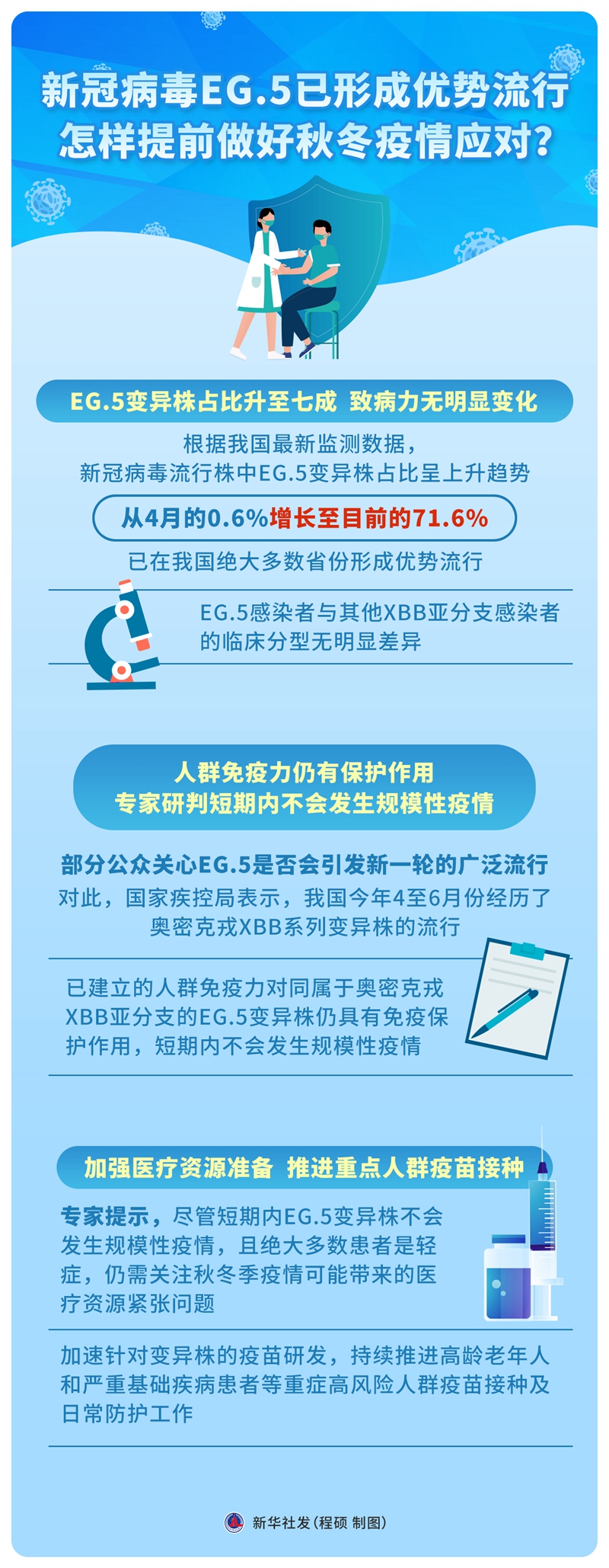 專家提示,盡管短期內(nèi)EG.5變異株不會(huì)發(fā)生規(guī)模性疫情,且絕大多數(shù)患者是輕癥,仍需關(guān)注秋冬季疫情可能帶來(lái)的醫(yī)療資源緊張問(wèn)題,加速針對(duì)變異株的疫苗研發(fā),持續(xù)推進(jìn)高齡老年人和嚴(yán)重基礎(chǔ)疾病患者等重癥高風(fēng)險(xiǎn)人群疫苗接種及日常防護(hù)工作。