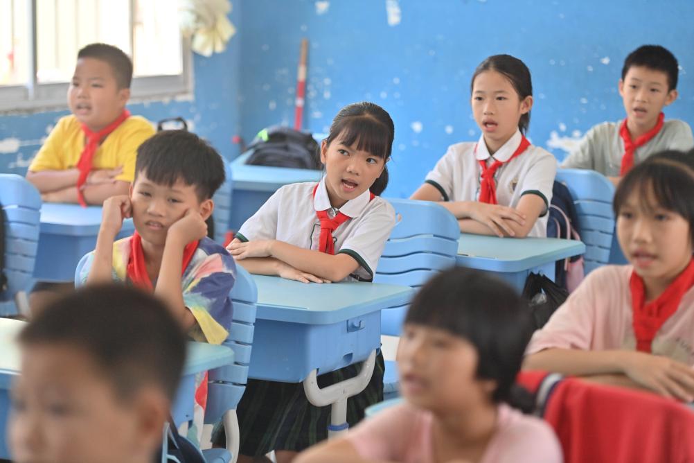 在梧州市長洲區長洲鎮泗洲小學,孩子們在跟著陳明仲學唱下俚歌(9月5日攝)。
