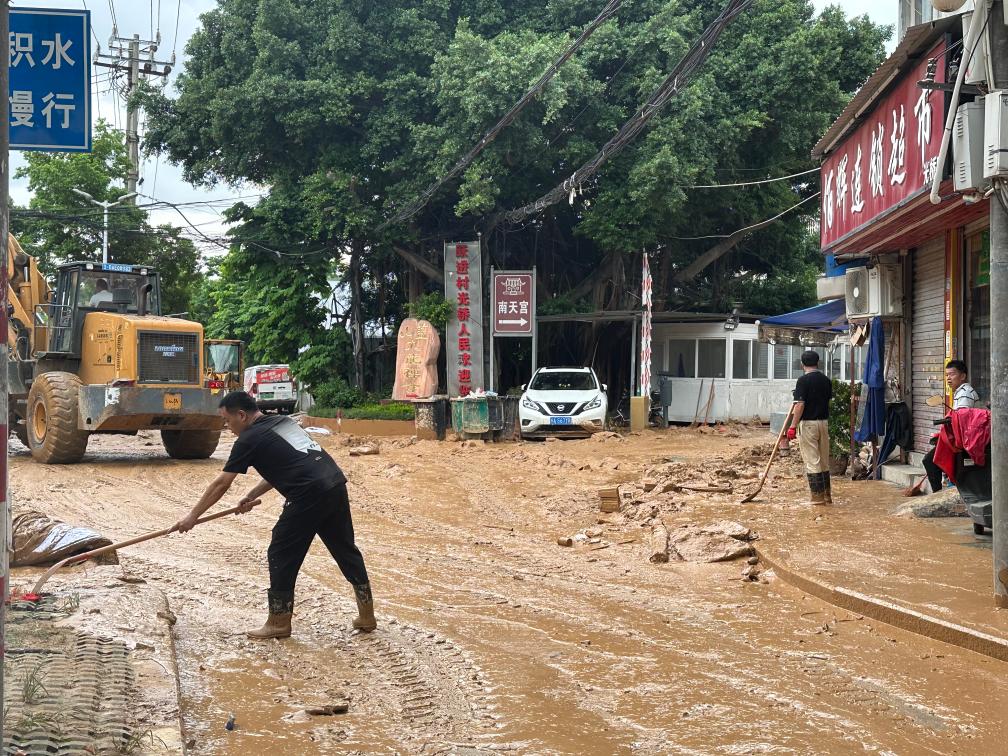 7日,躍進村人力與鏟車協同作業清理道路淤泥。新華社記者 鄧倩倩 攝