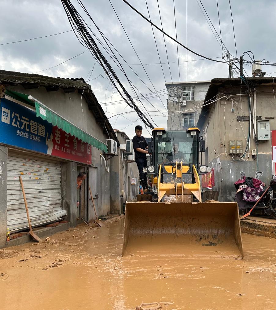 7日上午7時,為盡快疏通淤積道路,村干部、志愿者們再次投入清掃村道的工作中,并出動多輛鏟車配合清淤作業。多名村干部從汛情發生以來,一直守在村里,他們繼續幫村民清理房前屋后,指揮鏟車在主干道安全作業。