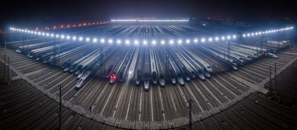1月7日凌晨,動(dòng)車組停靠在武漢動(dòng)車段的存車線上進(jìn)行檢修和保溫作業(yè)(無(wú)人機(jī)拼接照片)。新華社記者 伍志尊 攝