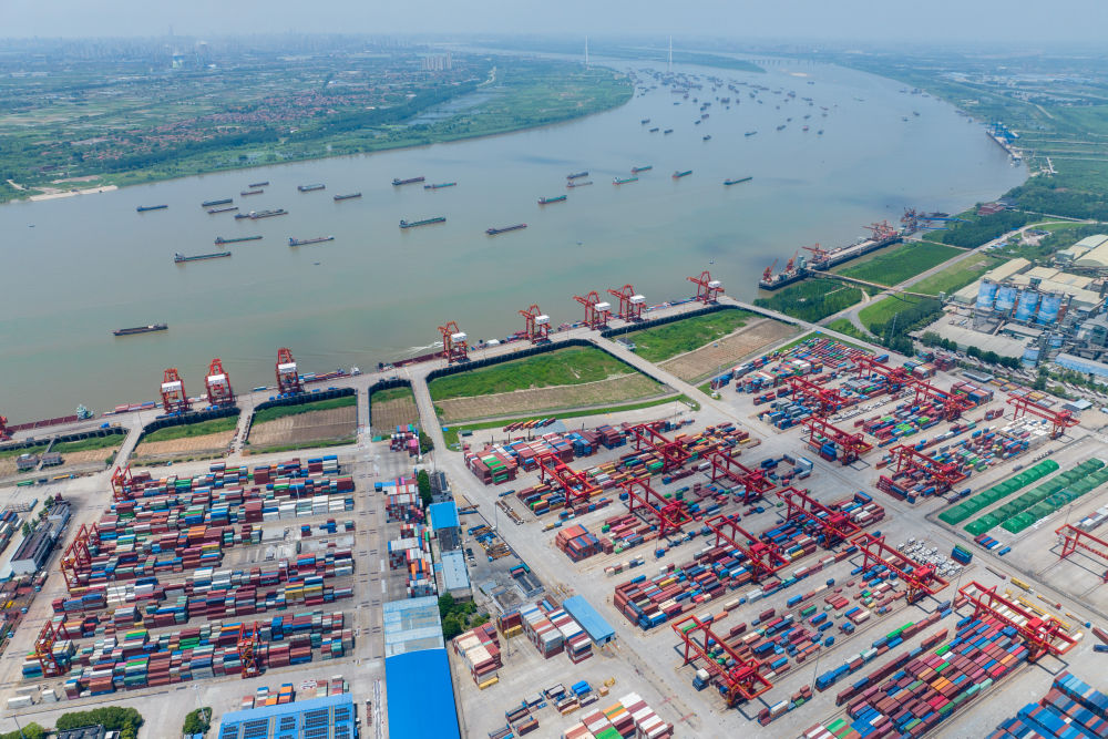 7月5日拍攝的武漢陽(yáng)邏港一期碼頭(無(wú)人機(jī)照片)。新華社記者 伍志尊 攝