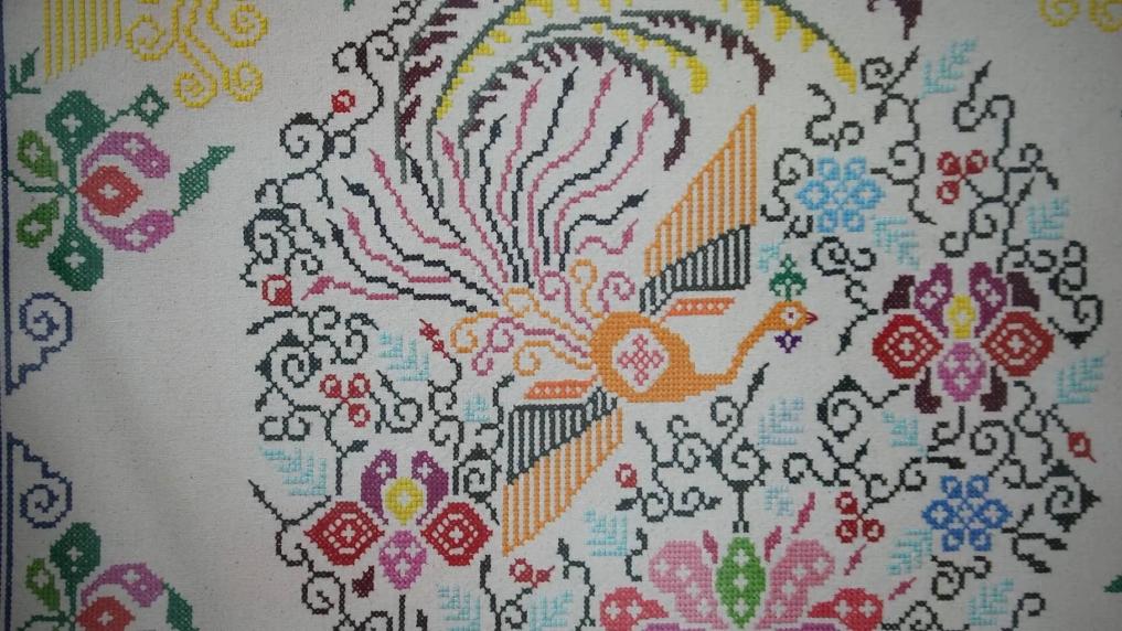 流行于陜西省漢中市城固縣一帶的城固架花,是陜西省非物質文化遺產項目。城固架花以白土布作底,以十字陣法為基礎,以花包花、疊加、對稱等獨特的表現(xiàn)手法,用針將五彩絲線繡在底布經線和緯線交織的網格上,形成色彩絢麗、立體感強的圖案。