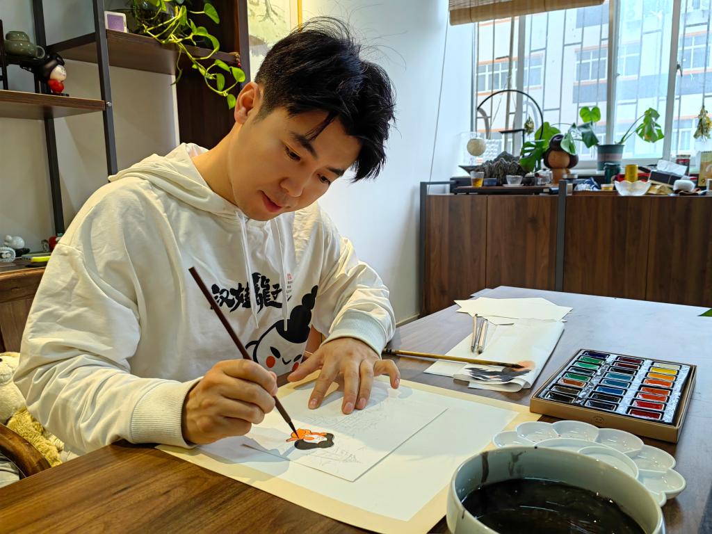 新華社西安10月14日電(記者孫正好)展開扇面,研墨,提筆,在水墨線條的勾勒下,一個微胖還有點“霸道”的唐朝小妞很快躍然紙上。作畫者是被諸多文創愛好者喚作“唐妞爸爸”的青年設計師喬喬。