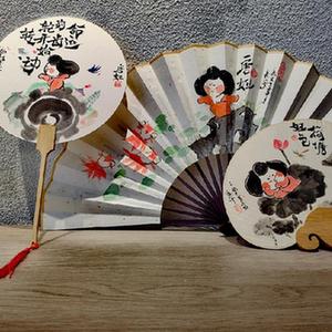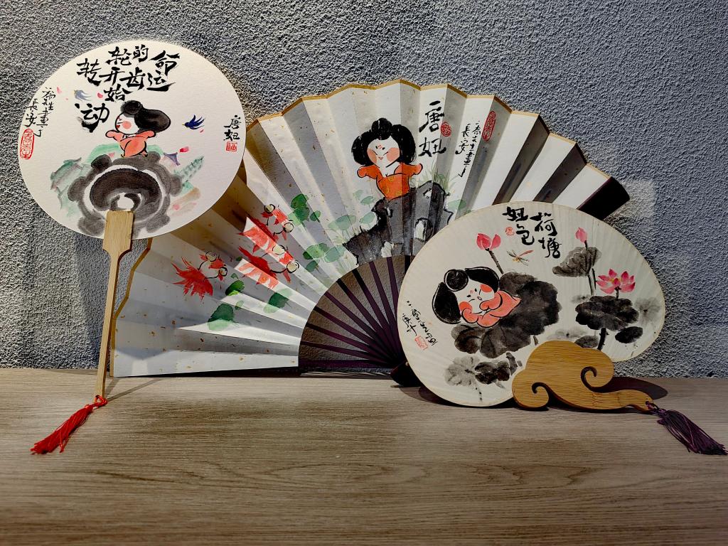 喬喬繪制的唐妞主題折扇、團扇。新華社記者 孫正好 攝