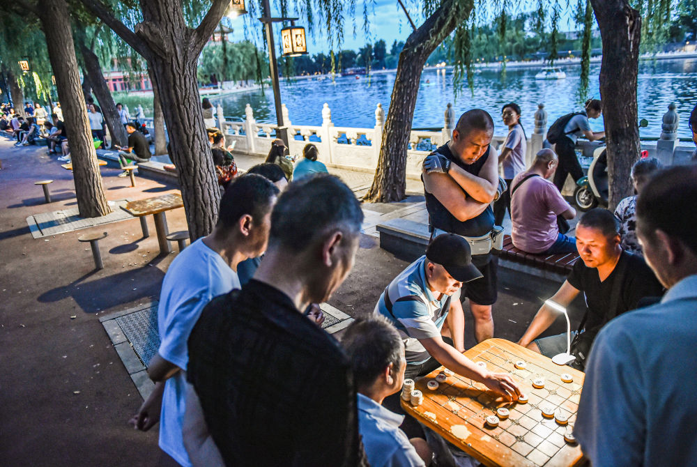 市民在北京什剎海邊下棋(6月10日攝)。新華社記者 陳鐘昊 攝
