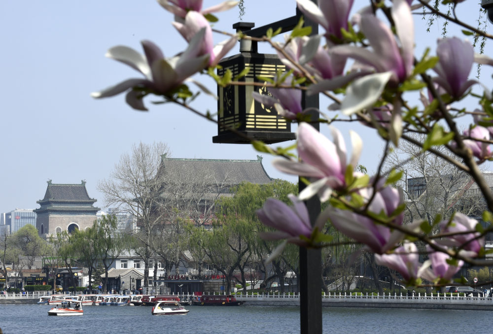 從什剎海東岸遠(yuǎn)眺北京鐘鼓樓(3月31日攝)。新華社記者 羅曉光 攝