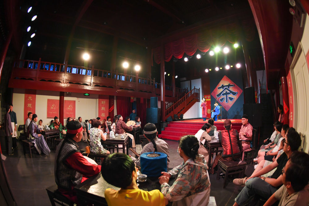 在北京市東城區(qū)顏料會館,觀眾在欣賞由北京市曲劇團(tuán)演員帶來的沉浸式北京曲劇《茶館》(7月7日攝)。新華社記者 鞠煥宗 攝