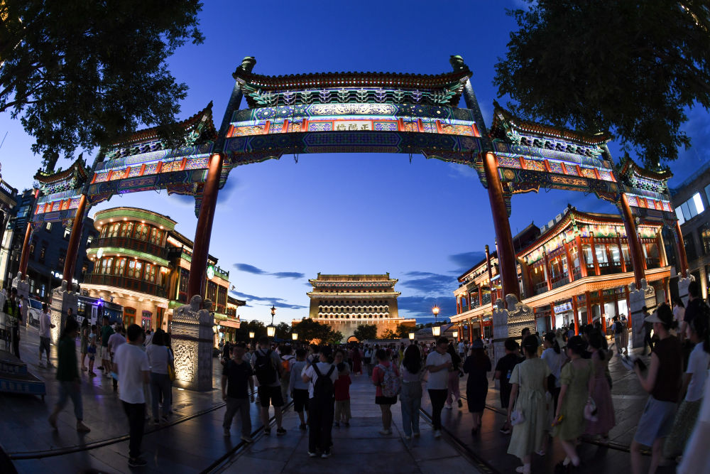 游客在位于北京中軸線的前門大街參觀游覽(7月8日攝)。新華社記者 鞠煥宗 攝