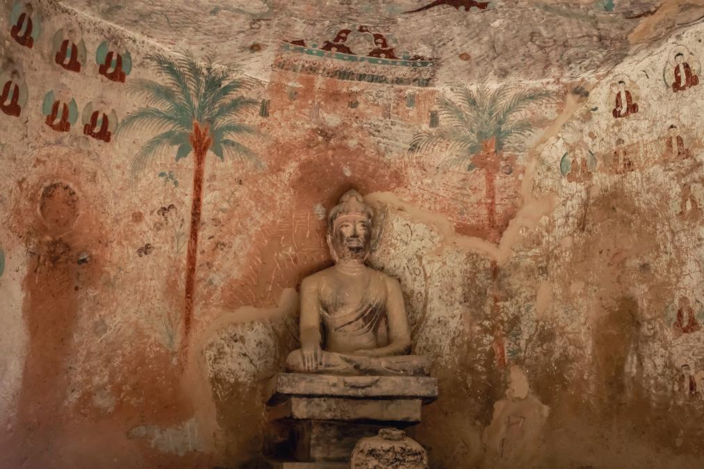 “第11窟開鑿于唐代,是一座馬蹄形穹窿頂窟,里面有一主尊石雕造像,身后,兩棵樹干高大形似南方椰子樹的壁畫生動(dòng)可愛,頂部蓮花藻井和飛天彩繪十分精美。”甘肅炳靈寺文物保護(hù)研究所講解員楊彩霞介紹,唐代是炳靈寺石窟造像的高峰期,現(xiàn)存三分之二的窟龕雕鑿于這一時(shí)期。