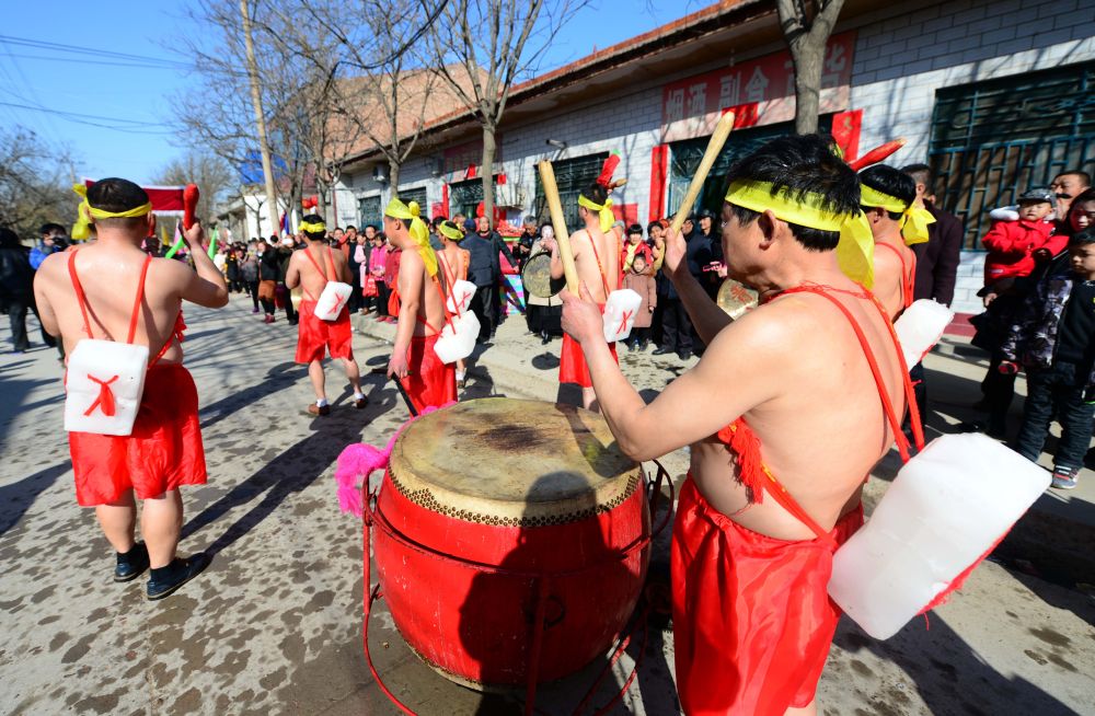每年春節過后,山西省永濟市長旺村的漢子們冒著嚴寒袒胸裸背地表演背冰。他們在鑼鼓伴奏下列隊前行,模擬下河、破冰、匍匐前進、刀槍不入等動作,展現黃河兒女彪悍強壯的陽剛之氣和“天不怕地不怕”的勇武精神。