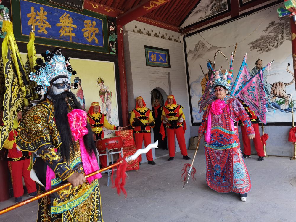 在位于黃河邊的山西臨猗縣古戲臺上,王午村十幾名村民化著戲妝、穿著戲服,正在演唱“鑼鼓雜戲”《三英戰呂布》。短短二三十分鐘,贏得臺下觀眾陣陣掌聲。