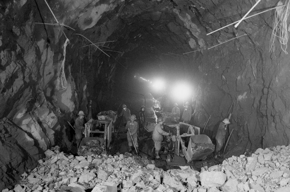1982年,鐵道兵第八師指戰員在引灤入津工程隧道施工中人工裝運石渣。新華社發