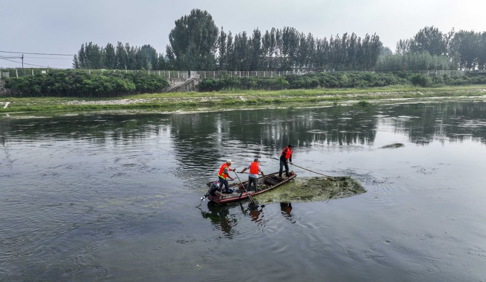 工作人員在引灤入津工程重要輸水河道河北省遵化市黎河打撈漂浮物(2023年9月11日攝,無人機照片)。新華社發(劉滿倉攝)