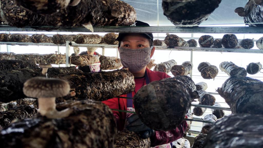 攀上山梁抬眼望,一排排藍(lán)色光伏板在陽光的映照下泛著銀光。光伏板下的大棚里,菌棒排列整齊。