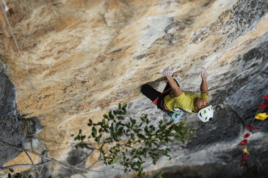 圖為攀巖選手在2020中國攀巖自然巖壁精英挑戰賽(廣西馬山站)中