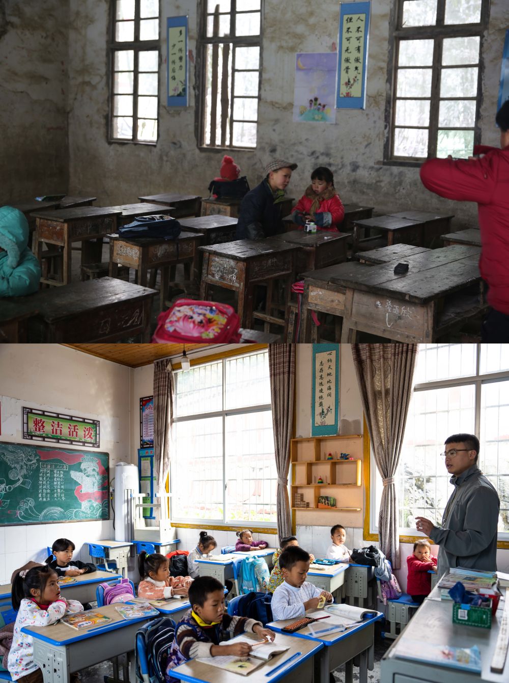 拼版照片:上圖為過去十八洞村小學內景(資料照片);下圖為2023年10月20日拍攝的翻修后的十八洞村小學內景(新華社記者陳思汗攝)。新華社發