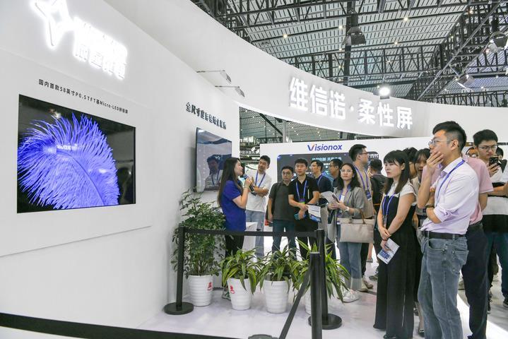 在“2023世界顯示產業大會新型顯示創新成果展”現場,觀眾在觀看58英寸P0.5TFT基Micro-LED拼接屏(2023年9月7日攝)。新華社記者 唐文豪 攝