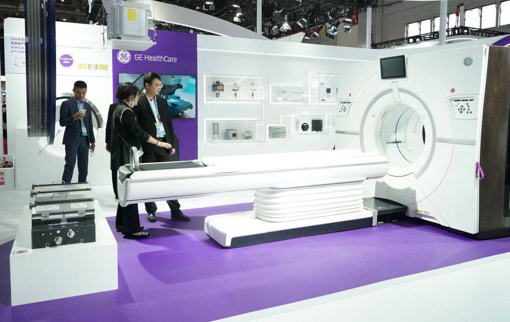這是在首屆中國國際供應鏈促進博覽會健康生活鏈展區拍攝的GE醫療展位(2023年11月29日攝)。新華社記者 任超 攝