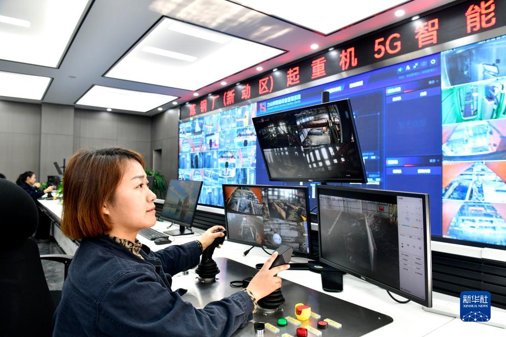 12月4日,工作人員在山鋼股份萊蕪分公司煉鋼廠起重機5G智能管控中心遙控操作吊運廢鋼。新華社記者 郭緒雷 攝