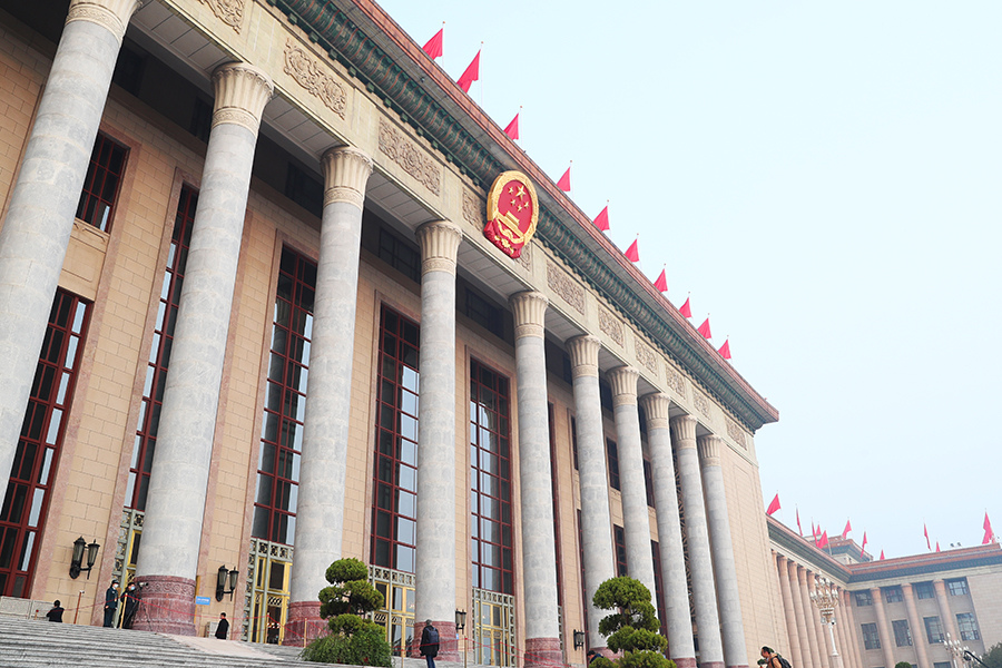 3月5日(星期日)上午9時(shí),第十四屆全國(guó)人民代表大會(huì)第一次會(huì)議在人民大會(huì)堂舉行開(kāi)幕會(huì)。圖為人民大會(huì)堂外景。(新華網(wǎng)記者 焦鵬 攝)