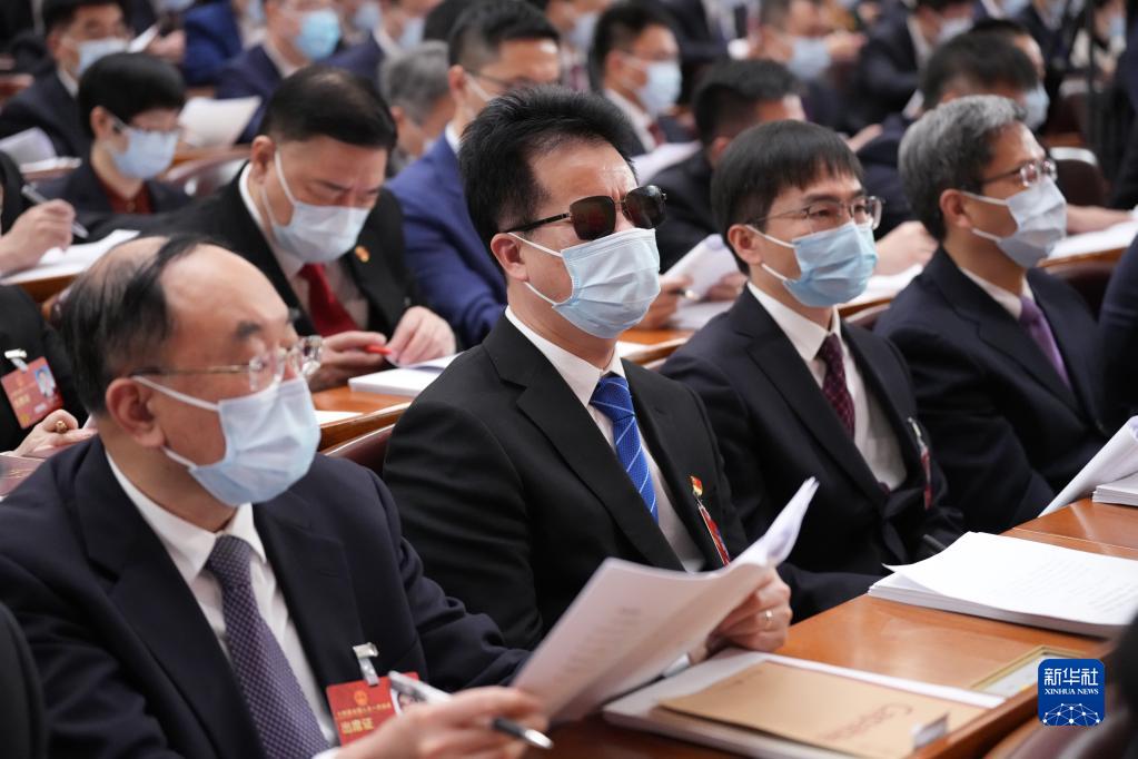 3月5日,第十四屆全國人民代表大會第一次會議在北京人民大會堂開幕。來自福建的全國人大代表王永澄(前左二)是一位盲人,這是他在認真聽會。