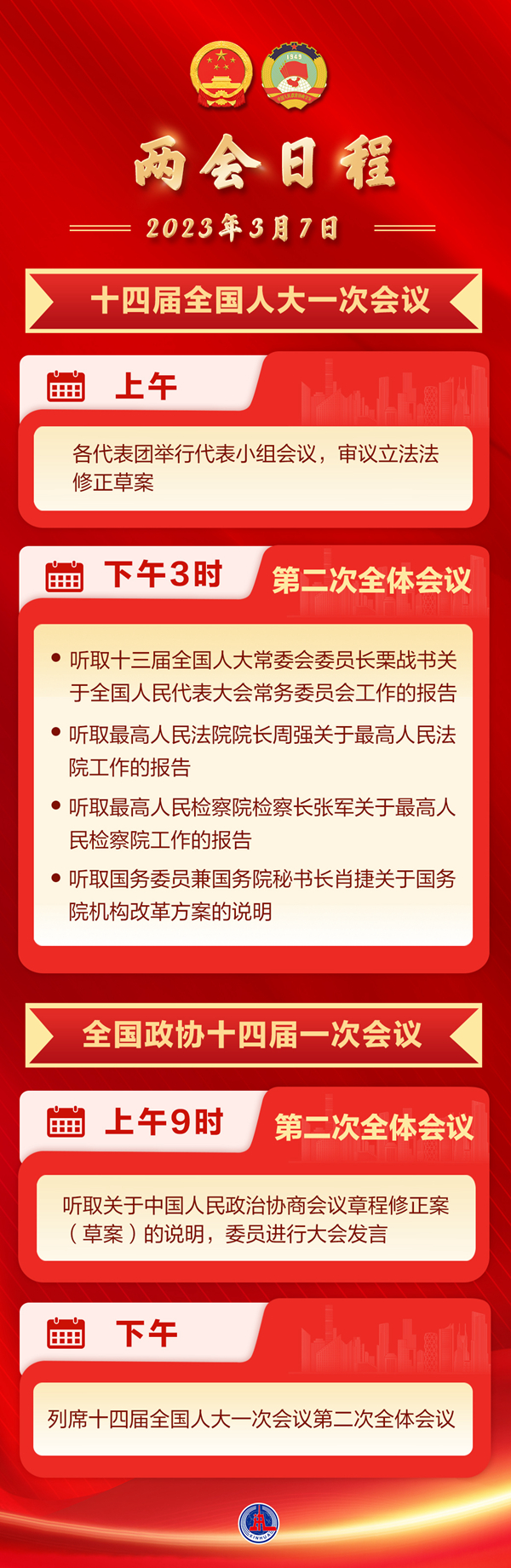 下午3時(shí),十四屆全國(guó)人大一次會(huì)議在人民大會(huì)堂舉行第二次全體會(huì)議,聽取十三屆全國(guó)人大常委會(huì)委員長(zhǎng)栗戰(zhàn)書關(guān)于全國(guó)人民代表大會(huì)常務(wù)委員會(huì)工作的報(bào)告,聽取最高人民法院院長(zhǎng)周強(qiáng)關(guān)于最高人民法院工作的報(bào)告,聽取最高人民檢察院檢察長(zhǎng)張軍關(guān)于最高人民檢察院工作的報(bào)告,聽取國(guó)務(wù)委員兼國(guó)務(wù)院秘書長(zhǎng)肖捷關(guān)于國(guó)務(wù)院機(jī)構(gòu)改革方案的說明。