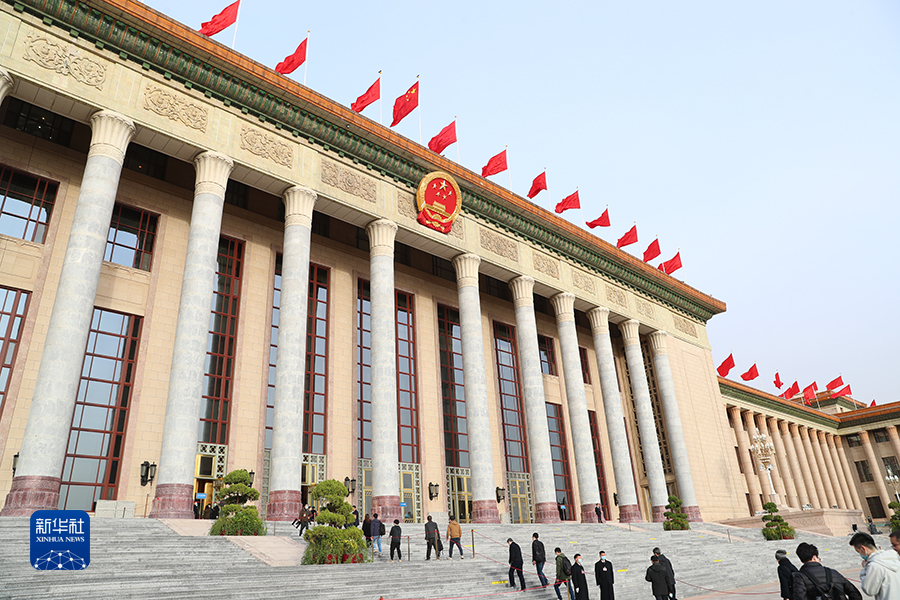 3月11日上午9時,十四屆全國人大一次會議在人民大會堂舉行第四次全體會議。圖為人民大會堂外景。 新華網記者 焦鵬 攝