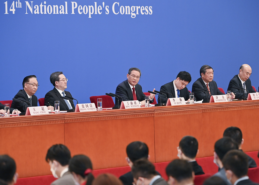 3月13日,十四屆全國人大一次會議在北京人民大會堂舉行記者會,國務院總理李強出席并回答中外記者提問。國務院副總理丁薛祥、何立峰、張國清、劉國中參加。